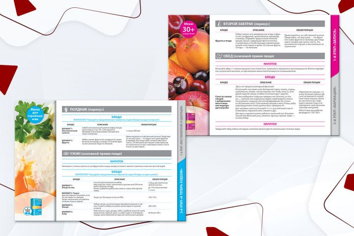 Задача состояла в дизайне на основе существующего стиля, подбору изображений и вёрстке информационных PDF-презентаций Системы сброса веса.