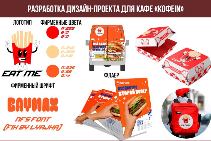 EAT ME — это современный городской фастфуд, специализирующийся на бургерах, картофеле фри и другой популярной уличной еде. Концепция заведения строится вокруг идеи яркого, быстрого и доступного питания для активных жителей города. Бренд сочетает вкусную еду, удобный формат доставки и запоминающийся визуальный стиль, который делает заведение узнаваемым среди других фастфуд-проектов.