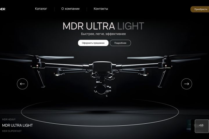 Разработать современный и премиальный дизайн первого экрана для презентации новой модели дрона MDR ULTRA LIGHT.