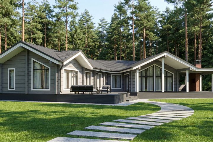 Планировочное решение дома организовано делением на три крыла, по которым распределяются группы помещений. Первое - общие зоны, второе - спальни, третье хозяйственные помещения. Такая планировка позволяет организовать открытые пространства, и изолировать тихие зоны дома.