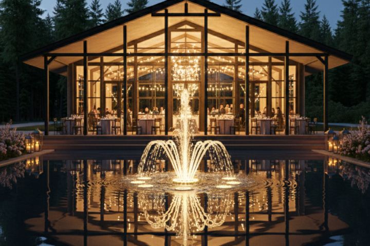 За основу архитектурного облика был взят стиль современного барнхауса (barnhouse) с характерной двускатной кровлей. Центральным элементом дизайна стало масштабное витражное остекление фасадов. Днем оно стирает границу между залом и лесом, открывая живописный вид на водоем с фонтаном, а вечером, благодаря продуманному освещению, превращает павильон в уютный сияющий «маяк».