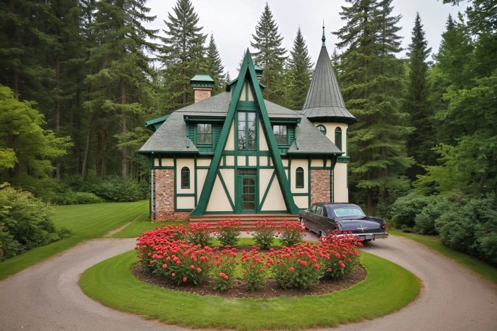 Для визуальной трансформации я выбрал стиль европейского романтизма с элементами шато и фахверка. Этот стиль позволил элегантно обыграть сложную геометрию старого здания (например, существующий эркер был превращен в изящную башню с конусной крышей и арочными окнами).