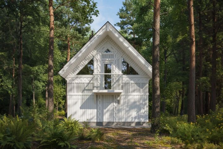 Передо мной стояла задача разработать более вместительную версию глэмпинг-дома, рассчитанную на комфортное проживание семьи или компании. Требовалось сохранить узнаваемый контрастный силуэт (белоснежные фасады и темная кровля), интегрировать в архитектуру балкон и, что самое главное, технологически продумать сложный фасадный декор для его реального воплощения в жизнь.