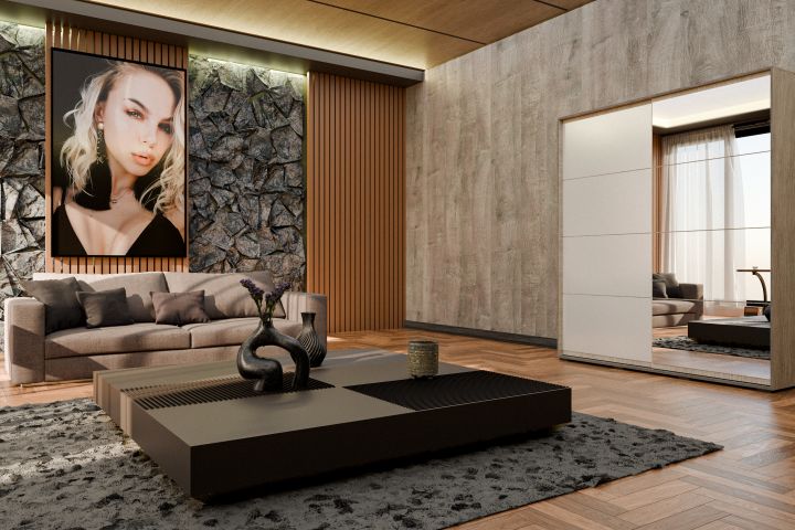 Мебельные решения: Центральным элементом композиции является низкий модульный кофейный столик со сложной геометрией. Лаконичный диван в нейтральных тонах и функциональный шкаф с зеркальным фасадом визуально расширяют пространство и добавляют света.