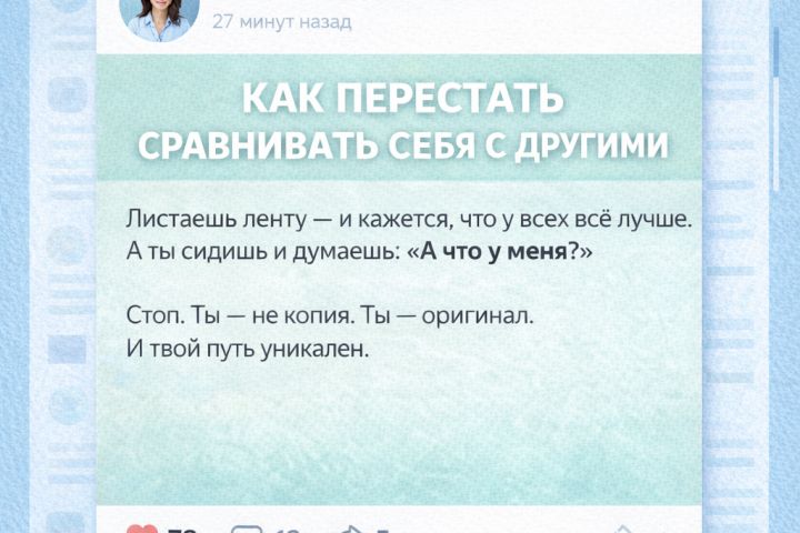 Клиенту (блогу «Психология для жизни») требовался пост, который поможет подписчикам перестать сравнивать себя с окружающими и вернуть фокус на свою жизнь. Цель — успокоить, поддержать, дать простые и понятные инструменты для работы с самооценкой.