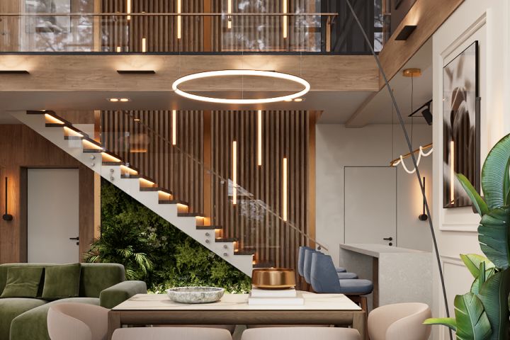 Дизайн интерьера двухсветной кухни-гостиной