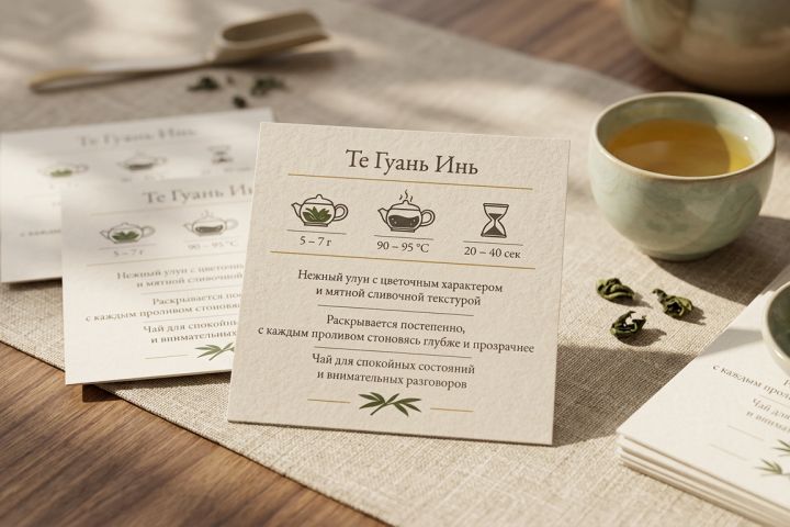 С одной стороны карточка должна быть простой инструкцией по завариванию чая с понятными иконками и кратким текстом — сколько заварки, температура воды, время настаивания. С другой — кратко раскрывать особенности сорта Те Гуань Инь, чтобы показать ценность продукта.