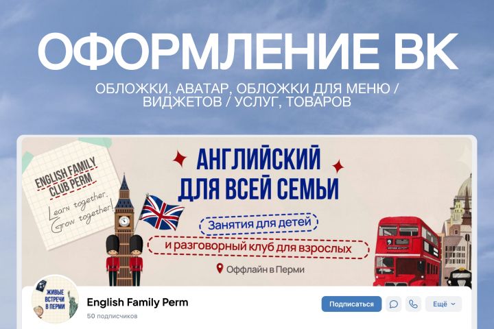 Разработала обложку для сообщества ВКонтакте для разговорного клуба английского языка для взрослых и детей.