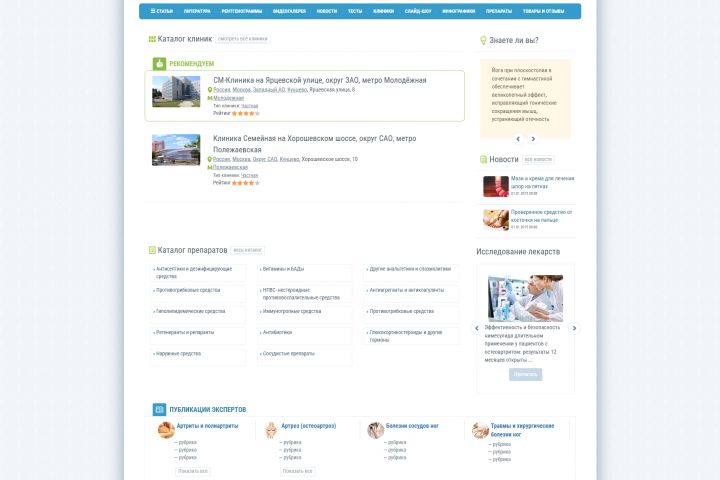 Веб-страница медицинского веб-сайта в минималистичном стиле; основной тон – пастельный, в основном светло-голубой и белый, с акцентами в оттенках зеленого и оранжевого; макет организован с использованием типографики и модульной сетки; изображения представлены в виде пиктограмм, иконок и небольших фотографий; освещение ровное и рассеянное, создающее ощущение ясности и чистоты; настроение – информативное и профессиональное с акцентом на здоровье и благополучие.