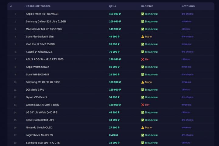 Разработал парсер для крупного интернет-магазина. Собрано 5000+ товаров с ценами, характеристиками и фото. Выгрузка в Excel с фильтрами. Python, BeautifulSoup, Selenium.