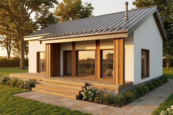 Тип дома: Деревянный каркас Крыша: Двухскатная Стиль: Скандинавский Этажность: 1 этаж Фундамент: винтовые сваи Снеговой район: III Пиломатериал: строганый 45х95, 45х145, 45х195 Особенности: второй свет, панорамные окна, балки LVL