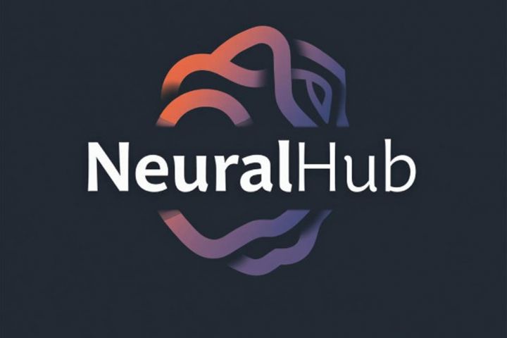 Лого состоит из текстовой части (белый шрифт "NeuralHub") и графического элемента на заднем плане — стилизованного изображения мозга, выполненного из переплетающихся объемных линий с градиентом от оранжевого к фиолетовому на темно-сером фоне