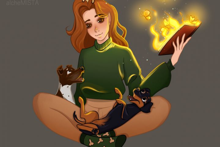 В работе я сосредоточилась на создании уютной композиции, которая объединила бы все три смысловых центра (героиню, книгу, собак) в единое целое. Чтобы изображение оставалось читаемым в формате аватарки, я выстроила пирамидальную композицию: фигура заказчицы в центре, собаки — рядом, создавая баланс. Книга в руках стала ярким цветовым акцентом, который сразу притягивает взгляд.