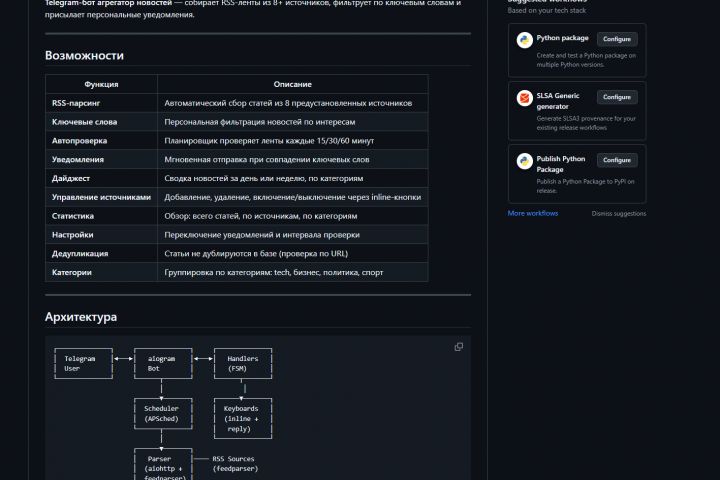 Нужен был инструмент для мониторинга новостей из множества источников с фильтрацией по темам. Всё управление и получение новостей — через Telegram.