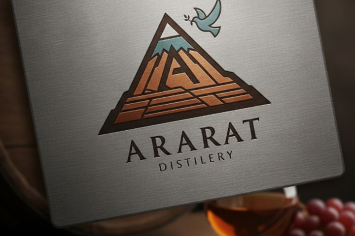 Графический знак выполнен в форме треугольника, внутри которого стилизованно изображены горные вершины с заснеженными пиками голубого цвета и горизонтальными линиями у основания (напоминающими деревянные бочки для выдержки коньяка или слои породы). В правом верхнем углу треугольника парит белая/голубая голубь с оливковой ветвью — символ мира, который является одним из ключевых образов армянской культуры. Все элементы нанесены на матовую металлическую пластину методом цветного тиснения в медно-коричневой гамме. На заднем плане еле заметны бокал с коньяком и виноград.