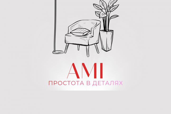 Иллюстрация (Line Art): Ручная зарисовка уголка комнаты (кресло, торшер, растение) подчеркивает камерность и теплоту бренда. Стиль скетча намекает на стадию эскизирования и творческий процесс дизайнера.
