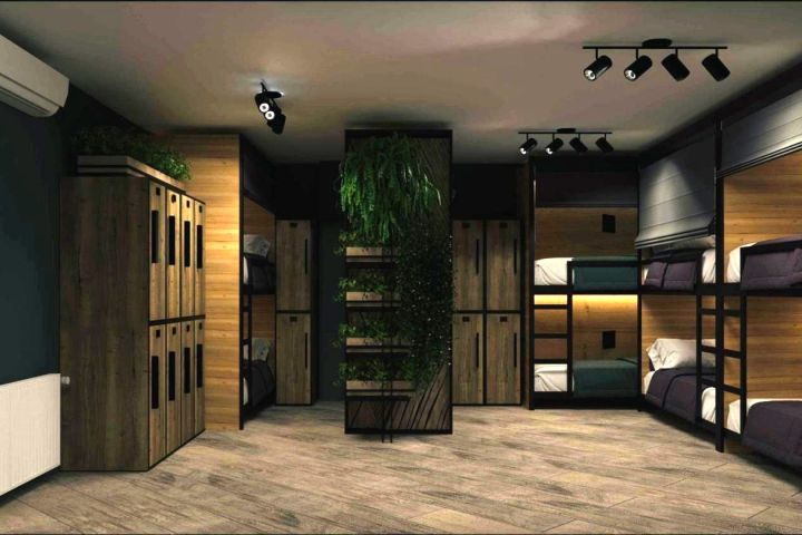 Решение было принято в пользу двухъярусных боксов с собственным мини телевизором с наушниками ,чтобы не мешать другим гостям, собственное освещение .В зоне столовой разместили кухню ,чтобы можно было без проблем приготовить еду и в уютной обстановке поужинать.Интерьер сделали в темных тонах .