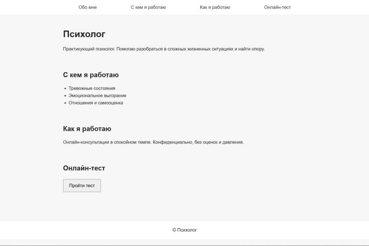 Проект Psychologist Landing — одностраничный сайт для частного психолога, направленный на привлечение новых клиентов и формирование доверия.