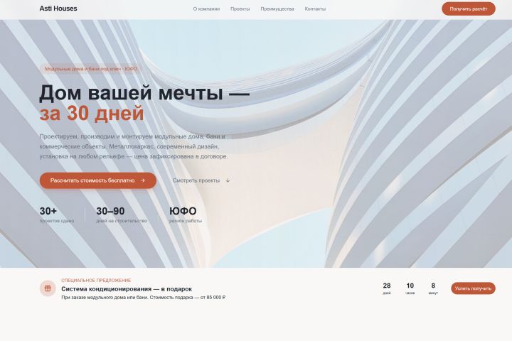 Разработали структуру и дизайн одностраничного сайта с нуля. Страница выстроена по логике: главный оффер («дом вашей мечты за 30 дней») → преимущества технологии → сегментация аудитории на два направления → портфолио реализованных объектов → пошаговый процесс работы с калькулятором стоимости → отзывы клиентов → призыв к действию. Визуально выбрали светлый стиль с терракотовыми акцентами — это создаёт ощущение тепла, надёжности и современности. Отдельно проработали блок с реализованными проектами с фотографиями и характеристиками, а также встроенную форму расчёта стоимости прямо на странице.