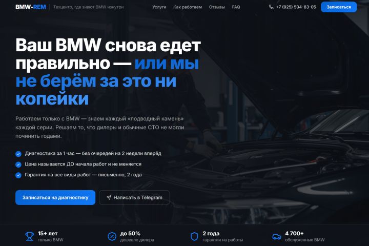 Клиент — специализированный автосервис BMW — обратился с задачей создать продающий лендинг для привлечения владельцев BMW в Москве. Ключевой вызов: рынок переполнен автосервисами, и нужно было сразу снять главное возражение клиента — «я уже был в сервисе, но машина всё равно не едет». Важно было выстроить доверие и показать экспертность команды ещё до первого звонка.