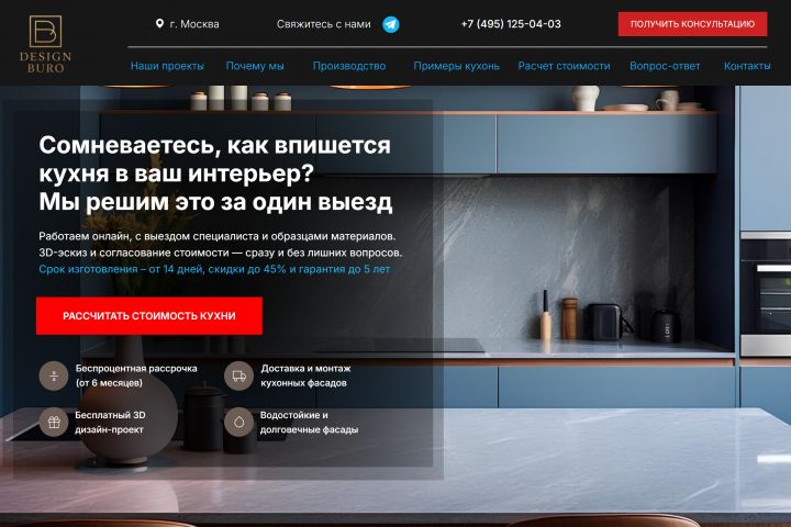 Создан готовый к запуску лендинг с каталогом, квизом и проработанным закрытием основного возражения «кухня на заказ — это дорого». Страница ведёт пользователя к целевому действию — записи на бесплатный замер или консультацию с дизайнером.