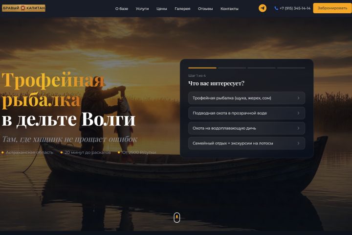 Клиент — турбаза в дельте Волги, специализирующаяся на трофейной рыбалке — обратился с задачей создать лендинг для привлечения гостей. Аудитория: рыбаки и любители активного отдыха на природе, которые ищут место для серьёзной рыбалки с проживанием. Ключевой вызов — передать атмосферу дикой природы и настоящей рыбацкой романтики, чтобы человек почувствовал себя там ещё до приезда, и выделиться среди множества похожих турбаз в регионе.