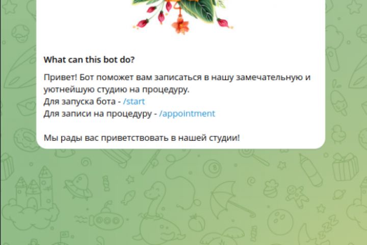 Телеграм бот позволяет взаимодействовать с клиентом и предоставляет функционал для записи клиента в салон красоты. Клиент может выбрать мастера, процедуру и конкретное время визита.