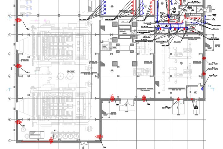 Проект выполнен в автокаде, расчет выполнялся по тепловым избыткам, нормируемым кратностям и данным от разработчика ТХ