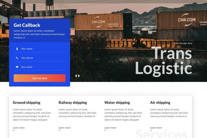Верстка лендинга. Одностраничный сайт с информацией о компании логистики. Форма обратной связи, модальные окна, адаптация под мобильные устройства, мобильная навигация.
