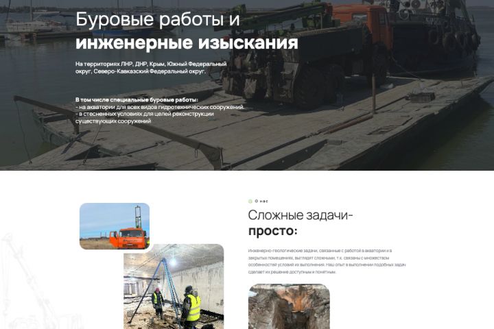 Сайт сделан на простой CMS, клиент сам правит цены и добавляет новые объекты в портфолио. Геолокация регионов в тексте и в мета-тегах помогла с поиском - теперь компанию находят по запросам инженерные изыскания Крым или бурение на акватории ДНР.
