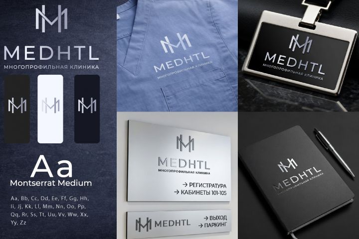 Проект представляет собой разработку визуальной айдентики для многопрофильной клиники MEDHTL. В основе — современный минималистичный подход, ориентированный на ощущение профессионализма, чистоты и доверия. Логотип построен на стилизованной монограмме «M», которая выглядит лаконично и технологично, подчеркивая медицинскую направленность и высокий уровень сервиса. Цветовая палитра выдержана в нейтральных, холодных тонах (темно-синий, серый, белый), что усиливает ассоциации с медицинской стерильностью и надежностью. В качестве шрифта выбран Montserrat — геометричный и легко читаемый, что важно для навигации и коммуникации в клинике.