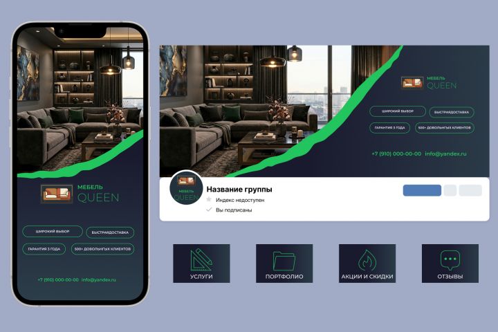 Адаптивная обложка: Дизайн продуман так, чтобы ключевая информация (логотип, контакты, УТП) не перекрывалась интерфейсом ВКонтакте ни на компьютере, ни в мобильной версии.