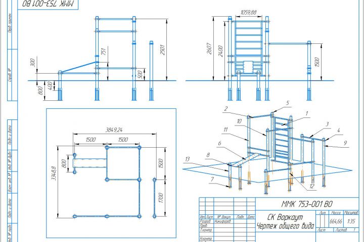 Заказчик — производственная компания, занимающаяся изготовлением уличных спортивных комплексов. Передо мной стояла задача: разработать полный комплект конструкторской документации на спортивный комплекс «Воркаут» (турники, брусья, лестница, площадка для пресса) для запуска в серийное производство.