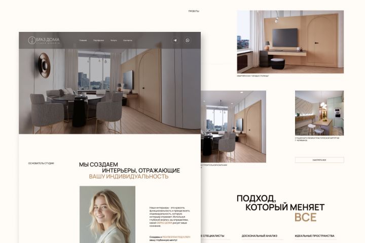 Стояла задача провести редизайн главной страницы сайта дизайнера интерьеров, создать современный и понятный интерфейс, который вызывает доверие и ясно показывает ценность услуг.