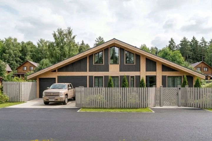 Был разработан проект современного дома с продуманным зонированием. Для придания фасадам статусности и выразительности выбрано контрастное сочетание темного и светлого дерева, а также интегрированы панорамные окна.
