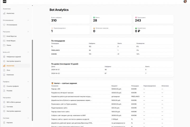 Стек: Python 3, Playwright, BeautifulSoup, python-telegram-bot, PostgreSQL 16, RouterAI API, DeepSeek v3.2, Laravel 12, Filament 3, systemd.