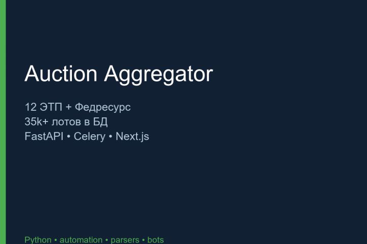 35 000+ лотов в БД, 12 активных парсеров, dashboard для фильтрации. Система в проде 6+ месяцев, 0% даунтайма.