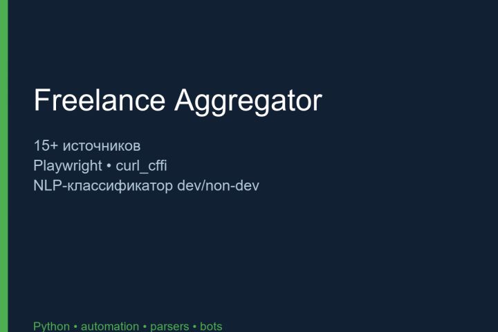 Гибридный парсер: httpx для простых платформ, curl_cffi для JA3-защит, Playwright с SOCKS5-мостом для SPA и авторизованных сайтов. NLP-классификатор dev/non-dev отсекает «ремонт» и оставляет разработку/ботов/парсинг.