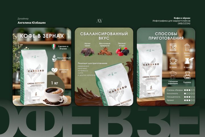 Кофе — это продукт эмоций и вкусовых ощущений. При создании инфографики для бренда Carraro моей главной задачей было передать эти ощущения через экран смартфона.