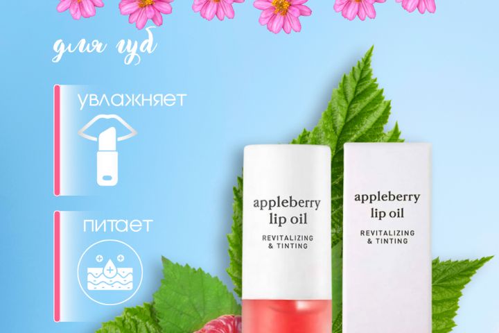 Работа с композицией: Объект (масло Appleberry) помещен в центр, создавая четкую иерархию. Дополнительные графические элементы (облака, лепестки) придают изображению объем и легкость.