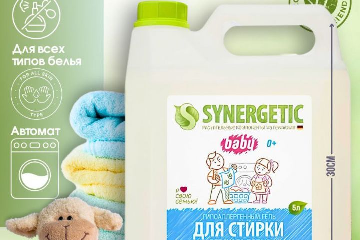 Разработать дизайн карточки для эко-продукта (Synergetic), акцентировав внимание на безопасности, натуральности и экономичности упаковки.