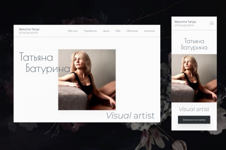 Сайт для фотографа в стиле минимализм с возможностью записи на съемку. На сайте представлена информация о творческом пути, портфолио, тарифы и контакты для связи