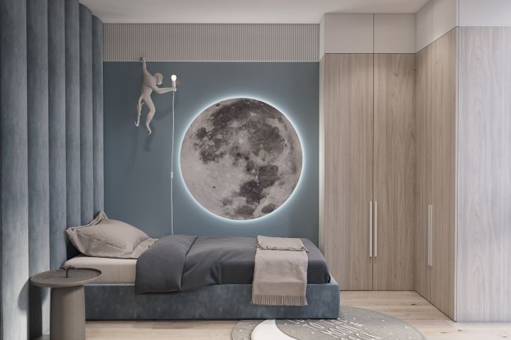 Оригинальные элементы декора, такие как светильники в виде луны и настенные наклейки добавляют индивидуальности. Эта комната — идеальное место для игр, творчества и отдыха, где каждый уголок вдохновляет на новые приключения и мечты.