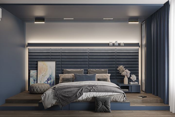 Спальня оформленная в синих оттенках, которые создают атмосферу спокойствия и уюта. В центре комнаты находится матрас, аккуратно расположенный на стильном подиуме, обрамленном мягкими линиями и текстурированными материалами. Подиум выполнен из светлого дерева, что придает пространству легкость и элегантность.