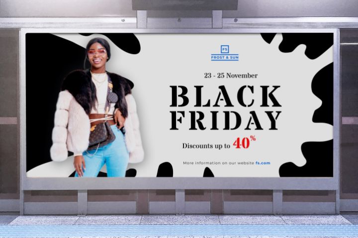 Баннер был разработан для магазина шуб к большой распродаже, по случаю черной пятницы. Главная задача - использовать черно-белые цвета, а также дополнить его фотографией модели с приятной и вызывающей положительные эмоции внешностью.