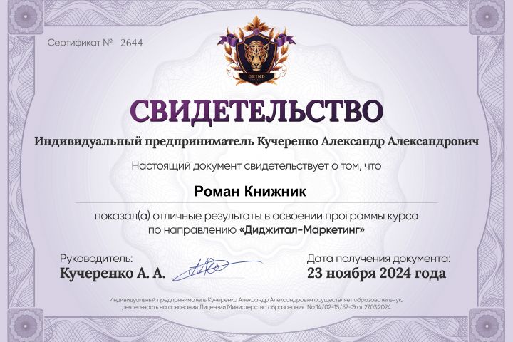 Свидетельство от Grind University 2.0