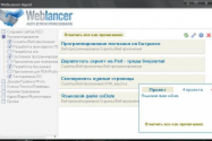Возможность установки фильтра работ, информирование о новых проектах всплывающими окнами, подсветка непрочитанных проектов. Программа автоматически запускается и висит в трее.