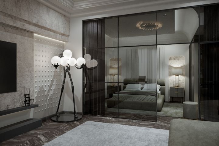 Нейтральная цветовая гамма и открытое пространство создают атмосферу спокойствия и уюта. Основные зоны объединены использованием камня, в гостиной в оформлении TV зоны, в кухне фартук и обрамление навесных шкафчиков, в спальне на стене у изголовья. Акцентом этого интерьера является скульптура-лампа в стиле Арт-деко.