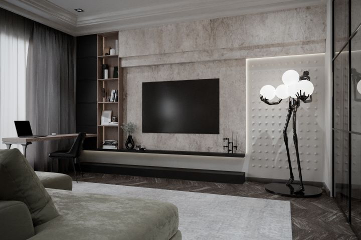 Нейтральная цветовая гамма и открытое пространство создают атмосферу спокойствия и уюта. Основные зоны объединены использованием камня, в гостиной в оформлении TV зоны, в кухне фартук и обрамление навесных шкафчиков, в спальне на стене у изголовья. Акцентом этого интерьера является скульптура-лампа в стиле Арт-деко.