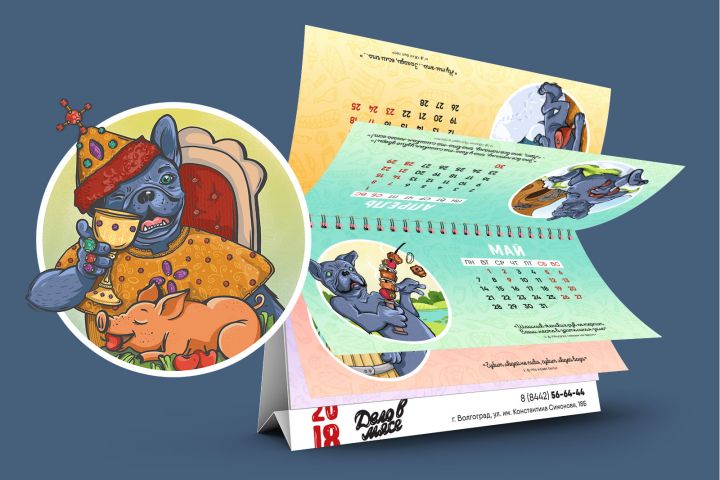 Дизайн календаря 2018 с иллюстрациями по фразам из известных фильмов. Идея заказчика: синий бульдог с мясной продукцией, фразы из фильмов.